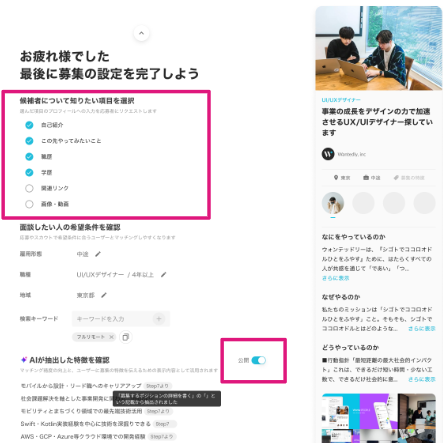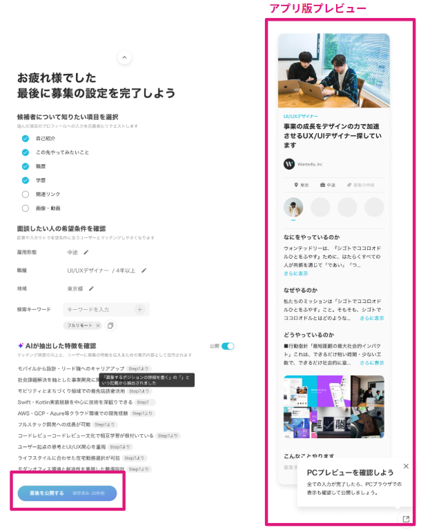 すべての入力が完了したら画面左下にある「募集を公開する」ボタンをクリックしてください。