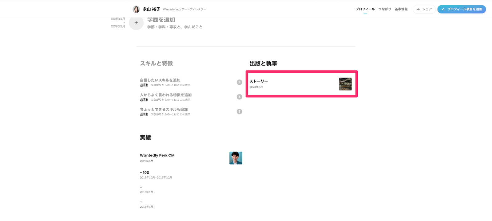 1_2. 「出版と執筆」欄に表示された該当のストーリーをクリックする