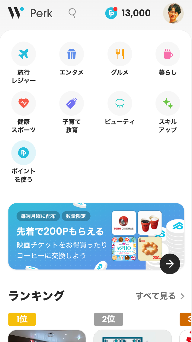 Perk内の「ポイントが貯まる特典」を利用してポイントを貯め、貯まったポイントをお好きな「ポイントを使える特典」と引き換えるものです。