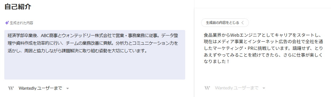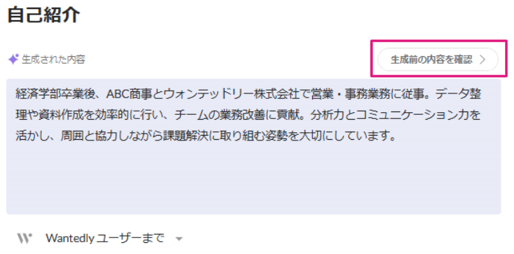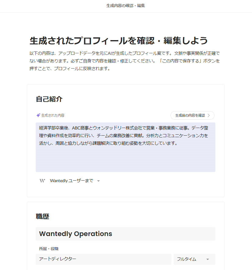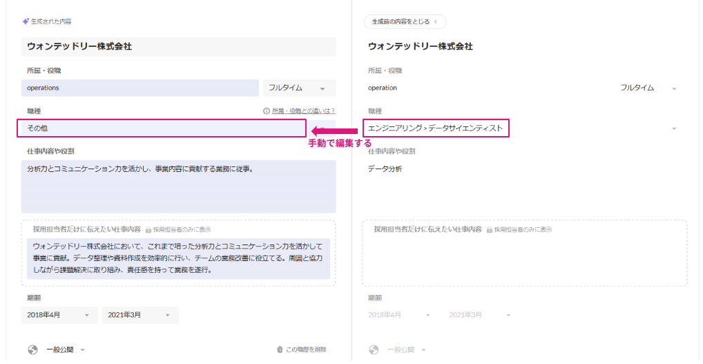 自動生成された内容にすでに登録している職歴内容の一部を反映させたい場合は、手動でコピー&ペーストなどで操作のうえ保存してください。