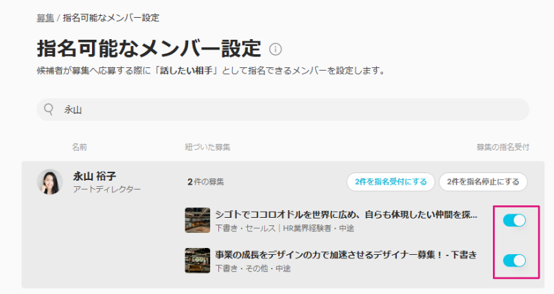 該当募集にメンバーとして追加されている、かつ指名設定をONにしたメンバーが指名可能な社員として表示されます。