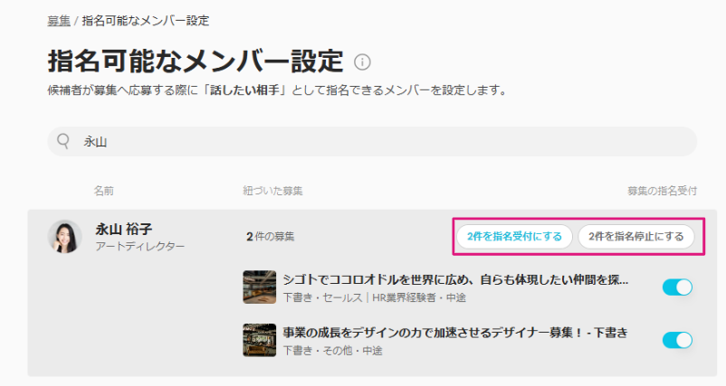 以下手順でメンバー別で紐づいている募集が確認でき、募集ごとで指名設定のON/OFFが可能です。