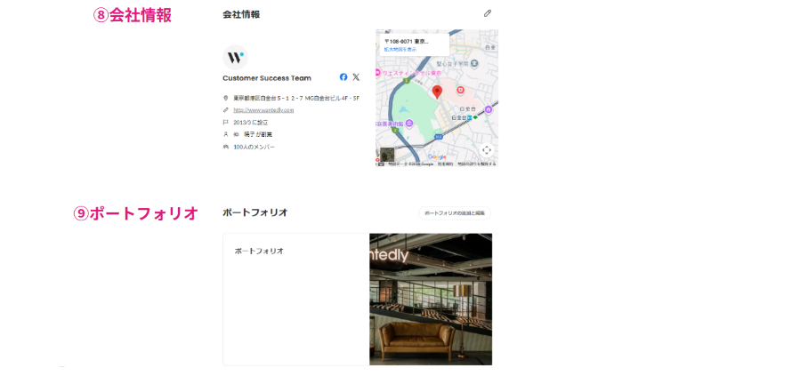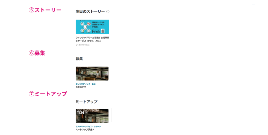 会社ページのホームは、以下の8項目で構成されています。