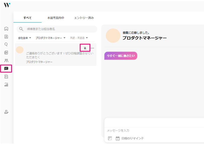 管理画面>「メッセージ」をクリック>該当の候補者にカーソルを当てる>ベルマークをクリック