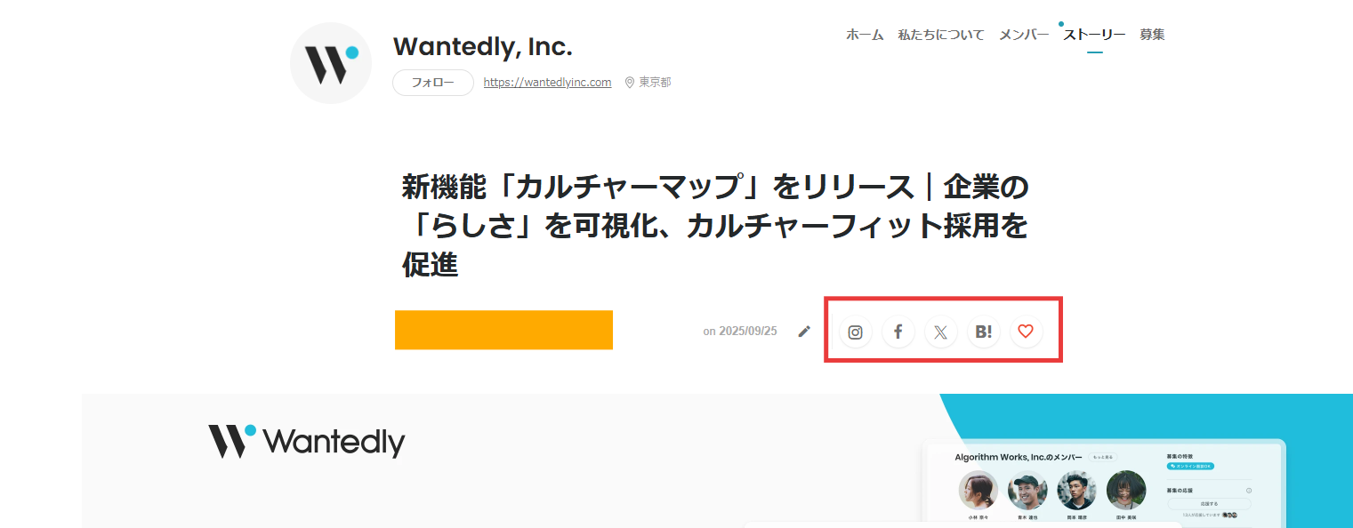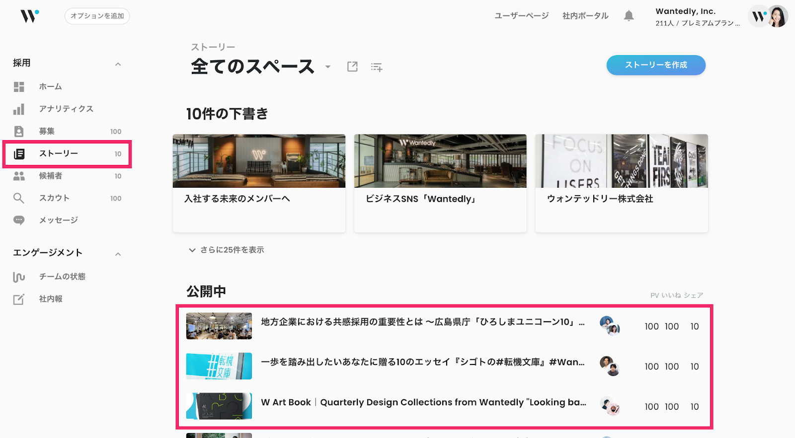 管理画面 > 「ストーリー」をクリック > シェアしたいストーリーをクリック