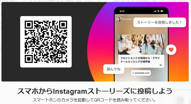 2. (PCのみ)QRコードが表示されるので、Instagramのアプリをインストール済みのスマートフォンで読み込む